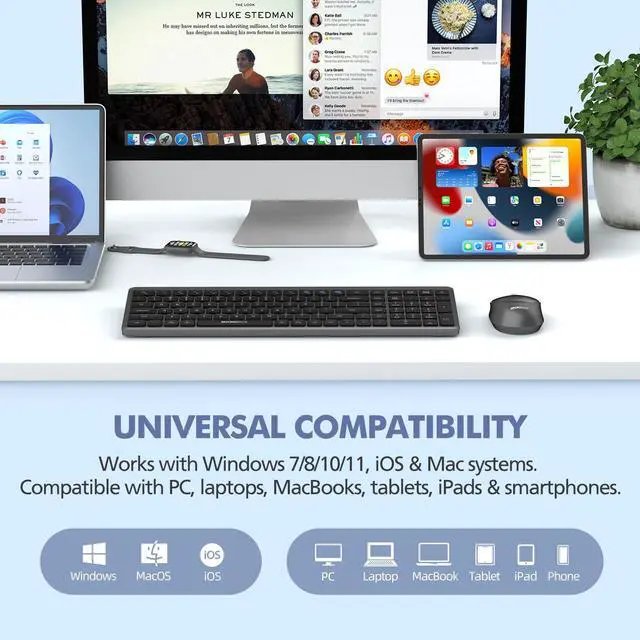 Universal CompatibilityThis Bluetooth wireless keyboard and mouse combo works with Windows 7/8/10/11, iOS, and Mac systems. Compatible with desktops, laptops, MacBooks, tablets, iPads, and smartphones.