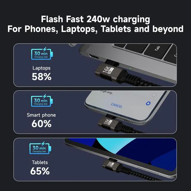 Single Cable Solution This versatile USB-C USB 5 cable right angle supports data, power, and video boasting 80Gbps super-fast data transfer, 240W super fast charging, and 16K@60Hz or 8K@120Hz video transmission. It serves as a one-cable solution for your power hub, laptop, phone or any other USB-C compatible device, eliminating the clutter and hassle of multiple cables and power adapters in your workspace.