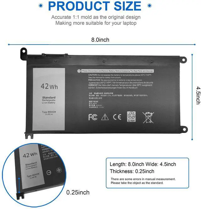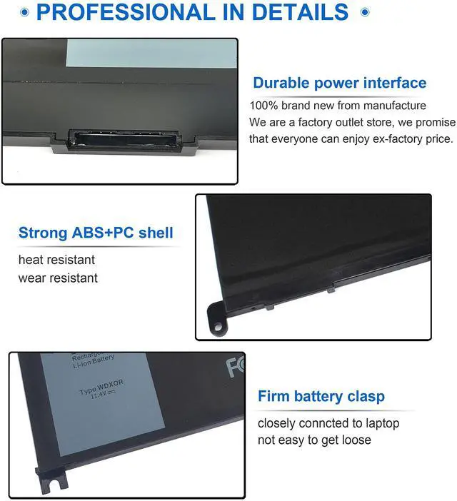 SPECIFICATION: Type: WDX0R, Rating: 11.4V, Capacity: 42Wh, Battery type: A+ 3-cell / Lithium-ion, 100% brand new, Black with two Screwdrivers for easy installation. Grade A cells ensure fast charges and low power consumption. Each of our WDXOR battery for Dell Latitude is CE-/FCC-/RoHS-Certified.
