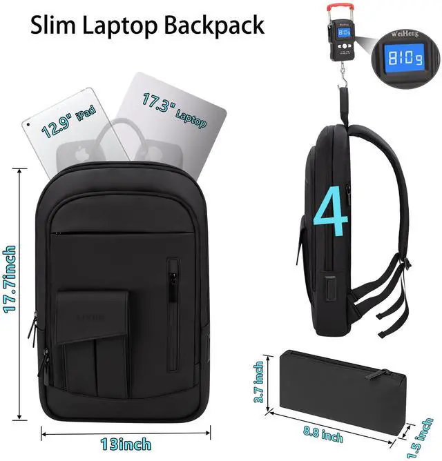 Perfect SizeThe size of the laptop backpack is 17.7*13*4in,and ONLY 1.8lb.(This lightweight business backpack is only for 17.3 inch laptop, Please check the SIZE before purchasing).This slim backpack also comes with an additional 8.8*3.7*1.5inch pouch.Lixiin waterproof backpack is suitable for work,commuting,traveling.This trael backpack is a gift for men/women!