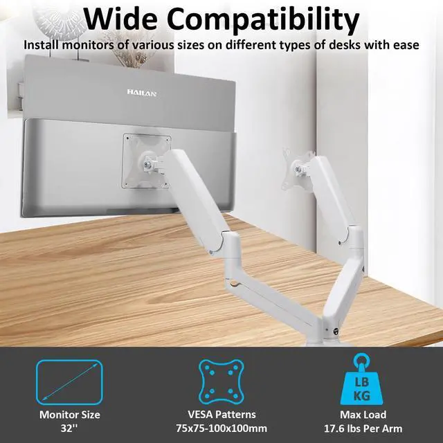 Universal Dual Monitor Arm The gas spring monitor arm is designed to most under 32 inch flat or curved monitors, holding 4.4 - 17.6 lbs screens. With VESA patterns 75x75mm and 100x100mm, compatible with Samsung, ASUS, Acer, LG, HP, AOC, Dell, Sceptre, etc. It is perfect for anyone seeking a sturdy and reliable full motion monitor mount for workspace.