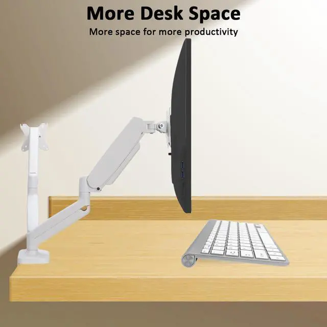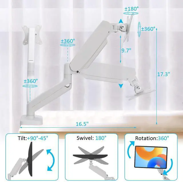 Full Motion Monitor StandFull Motion Monitor Stand: This dual monitor arm offers a wide range of movement. Supports screen rotates 360° for landscape or portrait orientation, swivels 180° to share your display, and tilts up 90°/down 45° for better viewing. The arm can extend up to 16.5" long, and rise up to 17.3" in height. Easy to find the right viewing angle and position. Tension adjustment is based on the weight of monitor and the gas spring is pre-set to mid-tension, please adjust tension after hanging on monitor.