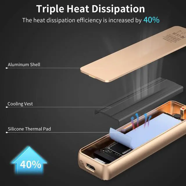 Triple Heat Dissipation Heat dissipation efficiency of NVME enclosure is increased by 40%. The sandwich structure composed of 'aluminum shellcooling vestsilicone thermal pad' closely contacts M.2 SSD, and quickly transfers the heat generated by SSD to the aluminum shell. The groove design on the surface of the M.2 NVMe SSD enclosure effectively increases the heat dissipation area