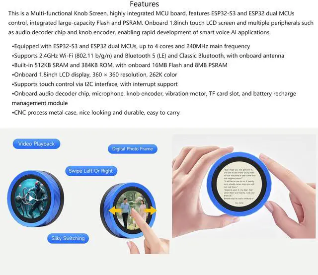 It features ESP32-S3 and ESP32 dual MCUs control (up to 4 cores and 240MHz main frequency), integrated large-capacity Flash and PSRAM. Onboard 1.8 inch Capacitive Touch LCD IPS screen (360 x 360 resolution, 262K color) and multiple peripherals such as audio decoder chip and knob encoder, enabling rapid development of smart voice AI applications.