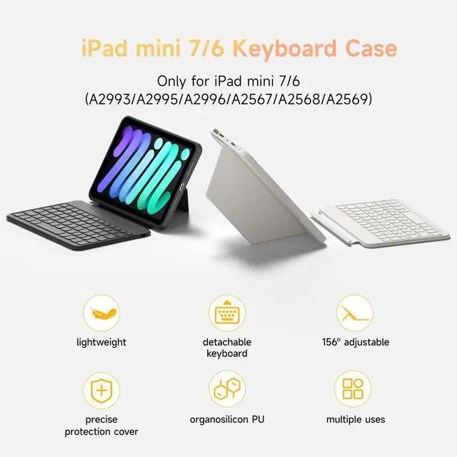 HOU Keyboard Case for iPad mini 7/6, 156° Adjustable Stand, Detachable Full Protective Case for iPad mini 7/6, 11 Shortcut Keys, 7 Color Backlight, Silicone PU, Multifunction, Bluetooth