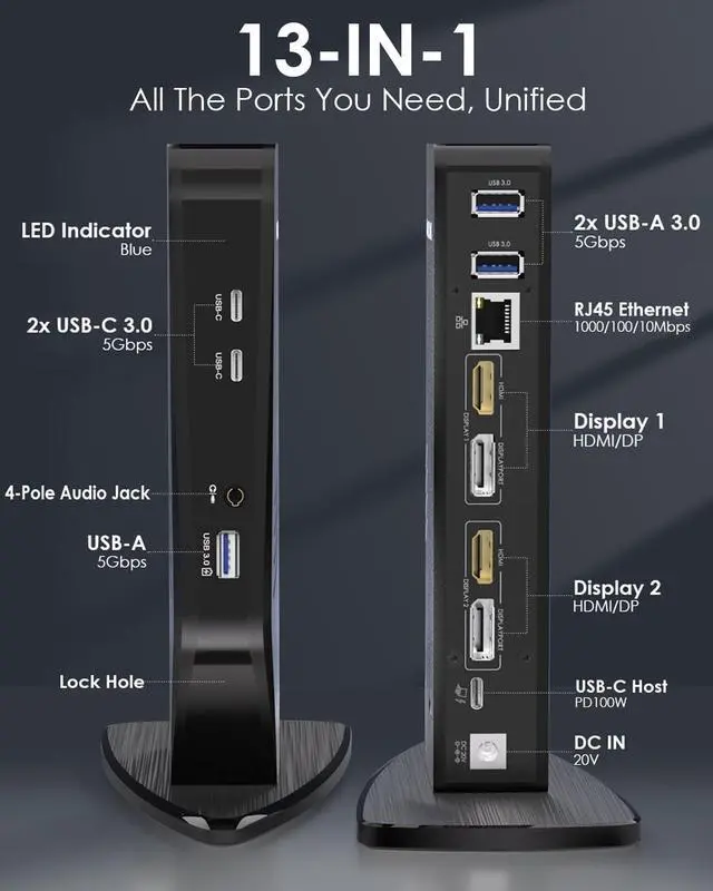 13-in-1 Dock: Organize your desktop with this versatile USB-C hub. It offers 13 practical ports, including 3 5Gbps USB 3.0 ports and 2 USB-C ports for fast file transfers; a stable Gigabit Ethernet port for lag-free network connections; and a 3.5mm audio/microphone port for your headphones. All your connections, in one integrated design.