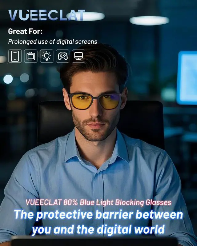 Sleep & Eye ProtectionBlock harmful 400-500nm blue light with lab-tested 80% filtration,VUEECLAT blue light blocking glasses can provide you healthier screen time. Reduce nighttime eye strain, protect melatonin production for deeper sleep, and prevent digital eye fatigue during work or gaming.