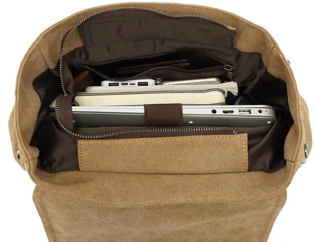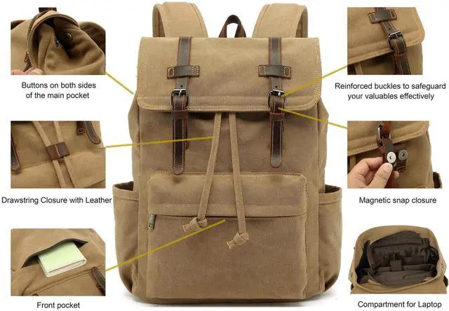 HuaChen Vintage High-Density Canvas Laptop Backpack With Leather Trim, Multi-Pocket Travel Rucksack For Laptop, Durable Hiking & Commuter Bag - M83 Khaki