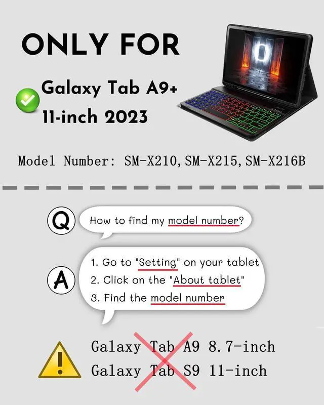 Model CompatibilityDesigned Only for Samsung Galaxy Tab A9+ 11-inch 2023 SM-X210/X215/X216B , Not compatible with other models. You can check the model number before purchasing to make sure you get the correct size tablet keyboard case.