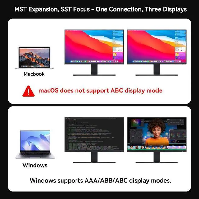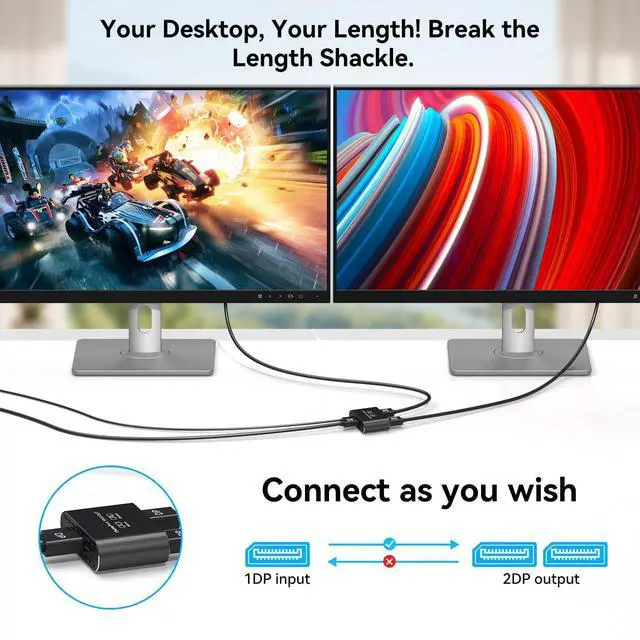 Displayport Splitter for Dual Monitors: This Display Port splitter converts one DisplayPort signal into two DisplayPort outputs, supporting one-way transmission only from a single DP source to two DP displays. Your computer must have a DP 1.2 or higher compatible graphics card and use a DP 1.4 (or above) standard cable no longer than 3.3 ft. Windows systems support both extended and mirror modes, while Mac only supports mirror mode