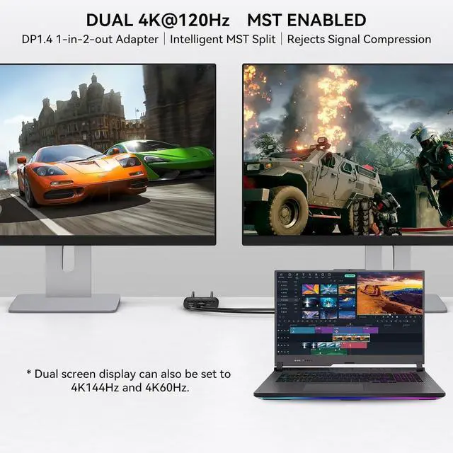 JCYMELE 4K120Hz Dual DisplayPort Splitter for 2 Monitors Extended Display Port to Dual DP Splitter 1 in 2 Out Adapter for Laptop, Computer, PC and Graphics Card