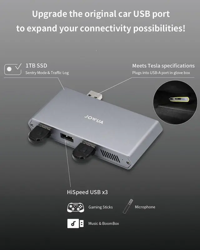 JOWUA 1TB SSD 3-Port HUB for Tesla 2025 New Model Y, 2024-2025 Model 3 Highland, Model X, Model S, Cybertruck 1, 3 USB-A Ports, Supports USB 3.2 Gen 2 and M. 2 NVMe SSD