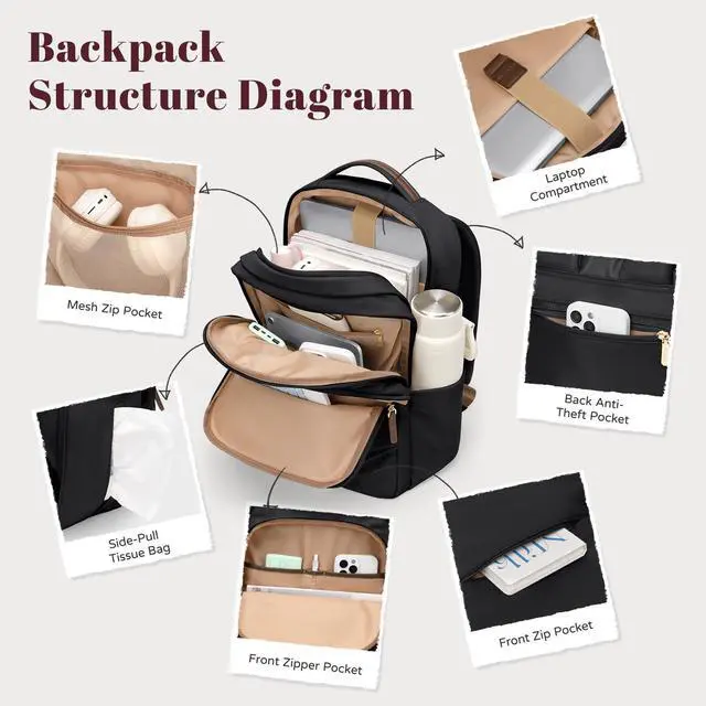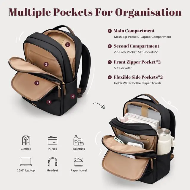 SMART STORAGE & ORGANIZED LAYOUT - Designed with 1 main compartment, 1 mesh zip pocket, 1 padded laptop sleeve (fits laptops up to 15.6 inch), 1 secondary compartment, 1 inner zip pocket, 1 mesh slip pocket, and 2 insert pockets. Exterior includes 2 front zip pockets (with 2 insert pockets + 1 pen slot), 1 rear zip pocket, 1 side pocket, 1 tissue side pocket, 1 earphone port, and 1 luggage strap.