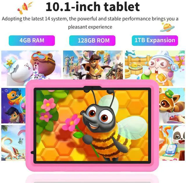 VOLENTEX Android15 Tablet, 10.1 inch Kid Tablets, 128GB Educationl Pad for Age 3-15 Toddler, WiFi, Bluetooth, Dual Camera,Games,Parental Control, with Case (Pink)