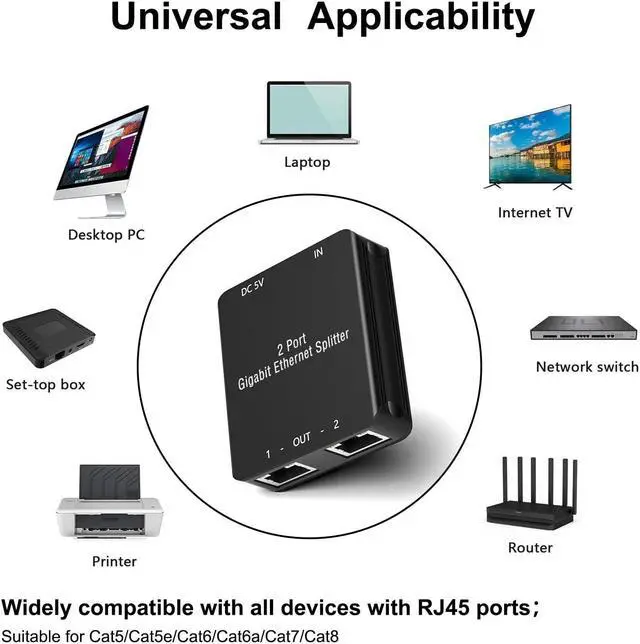 Universal Compatibility. The RJ45 LAN Ethernet Splitter connector is flexible to use with a variety of networks, compatible with Cat8 Cat7 Cat6 Cat5 Cat5e Network Ethernet Cable