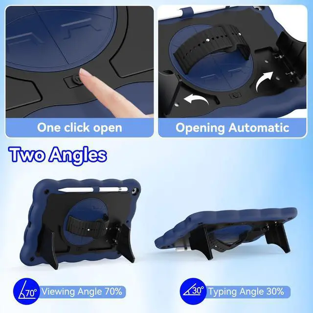 Automatic Opening & Functional Kickstand: Press the small button in the middle of the kickstands, and both sides of the stand will automatically open, adding fun. There are two angles for you to type, play games, or watch videos at home or when going out