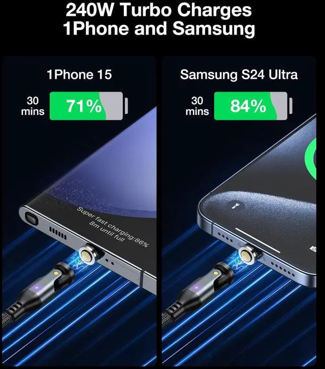 - : Harness the power of 240W charging and USB Power Delivery Technology. The magnetic charging cable type c your devices swiftly, saving you time and ensuring you're always connected. It can fully charge a Phone 15 96%, a Switch 90%, a Samsung S23 96%, a McBook Pro 86% and an Pad Pro 89% in 35 minutes. No more idling while a battery charges slowly. NOTE: Please be aware that a C port adapter with the appropriate power is required.