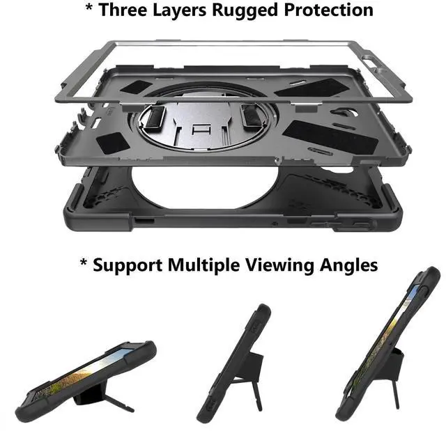 360 Rotating & Handle Strap: Soft Handle strap with 360 Degree rotating design provides Three angles viewing, easier to use your tablet in your outdoor travelling, working, gaming with kids.