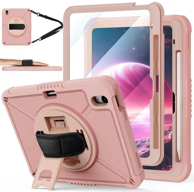 ZtotopCases for iPad (A16) 11th/10th Generation 11''/ 10.9 '' with Screen Protector, Pen Holder, Handle Shoulder Strap, 360 Rotating Stand Rugged Protective Case for iPad 11th Gen 2025(A3354/5), Pink