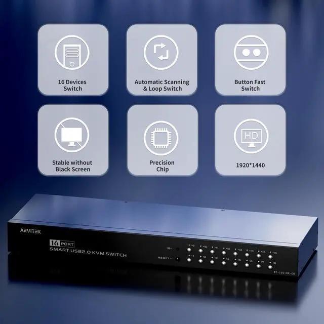 16 Port VGA KVM SwitchArvitek 16x1 VGA KVM Switch is for controlling up to 16PCs share 1 monitor and a set of wired/wireless keyboard, mouse, printer, scanner, USB disk, which saves time and space greatly.