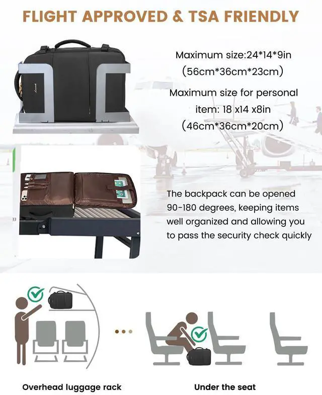 AIRLINE APPROVED & TSA FRIENDLY:Dimensions 19.2*13.5*9 inch, Light Weight 3 lb, Capacity 35L,our carry on backpack meets the requirements of airlines like Spirit, Frontier, and JetBlue. It fits under seats and in overhead compartments, with a 180° opening laptop compartment for quick security checks.