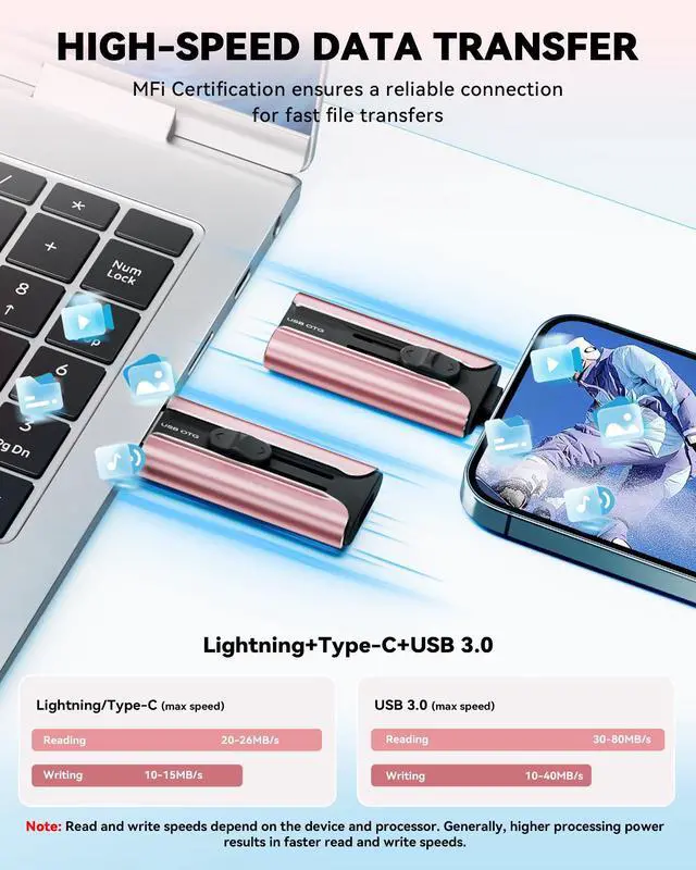 MFi Certified High-quality iPhone Flash Drive: This usb flash drive for iphone is MFi certified, made with high-quality frosted aluminum and advanced chip technology to ensure excellent performance. Its unique retractable design and attached keychain add portability, protecting the connector from damage when not in use and reducing the risk of loss. (Note: iPhone users should download the required app from the App Store before use, while Android users simply need to enable the OTG function.)