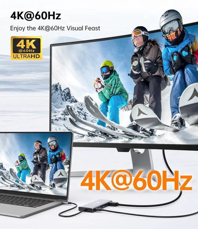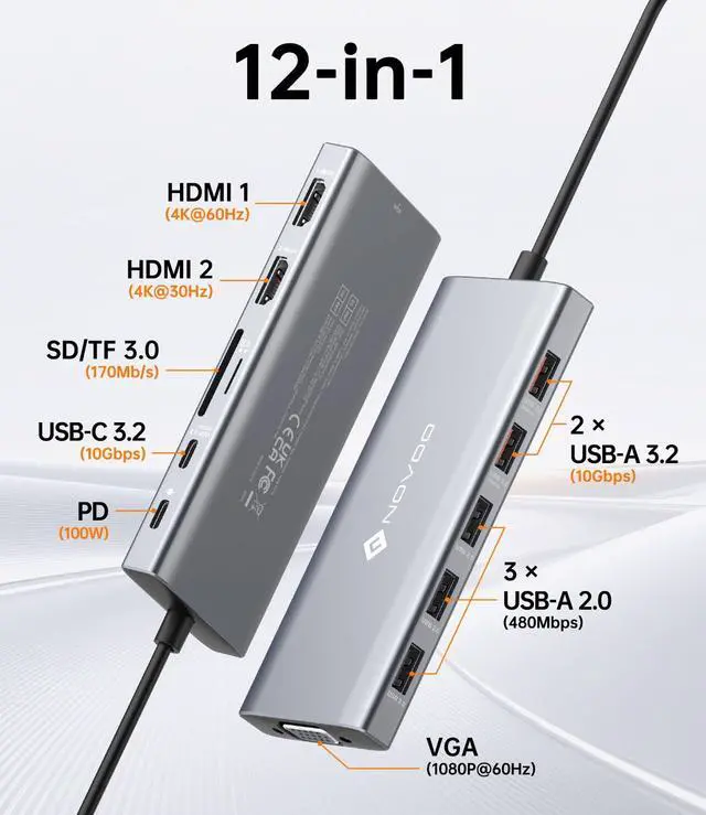 12-in-1 Laptop Docking Stationlug and play hub expands your laptop with 2×HDMI (4K@60Hz + 4K@30Hz), VGA (1080P@60Hz), USB-C 3.2 (10Gbps), 2×USB-A 3.2 (10Gbps), 3×USB 2.0, SD/TF 3.0 card reader (170MB/s), and 100W PD charging port.