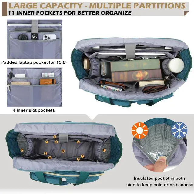 Massive Storage: BISKLNDN teacher tote bag features large storage with 11 inner pockets, easily keep your books/files/teaching materials/college supplies/medical supplies/daily necessities well-organized, and dual padded compartments securely hold your 15.6" laptop and a 12.9" tablet pc, inner sides insulated pockets of this teacher bag keep your drinks/snacks cold or warm for hours