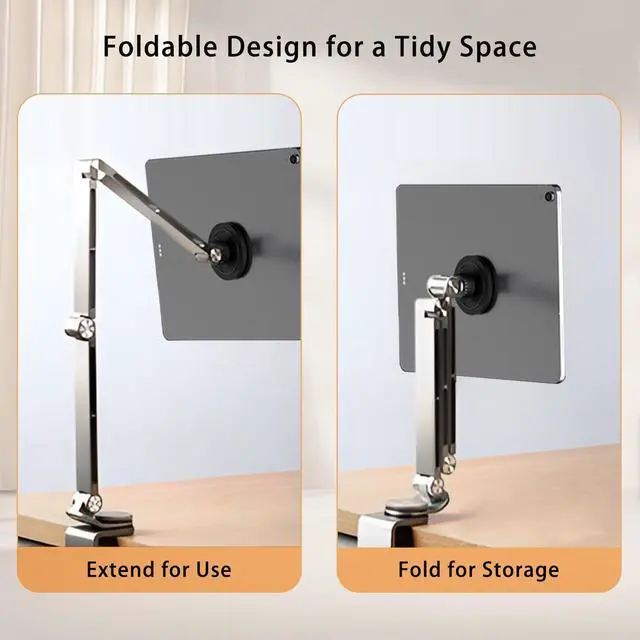 FULLY ADJUSTABLE DESIGNFeaturing a 3-section long arm and 360° rotating base, this tablet holder mount offers greater flexibility and longer reach. It bends and rotates for the perfect viewing angle, whether you're standing, sitting, or lying down. Ideal for watching movies, gaming, reading, or cooking.