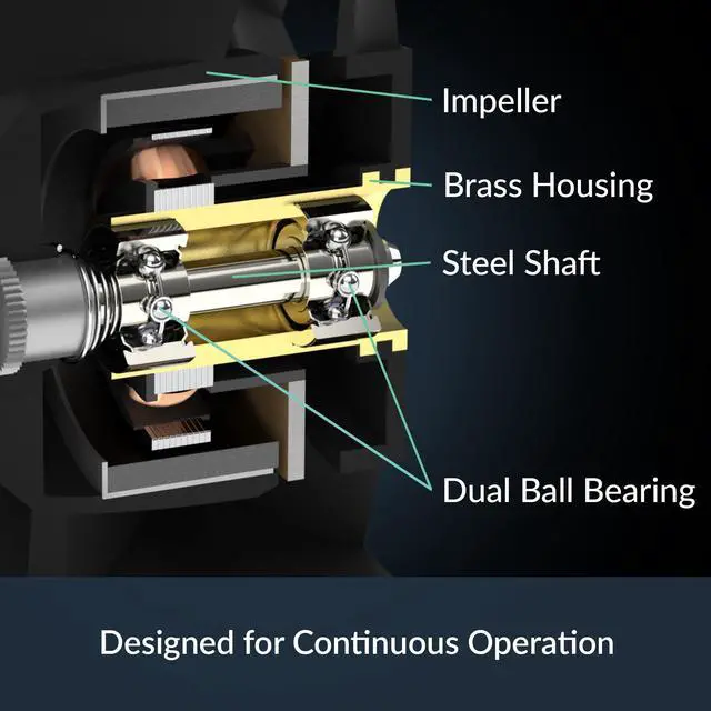 TheS4028-15K's impeller is held in place by two ball bearings, making it both particularly durable and less sensitive to external influences like heat and dust
