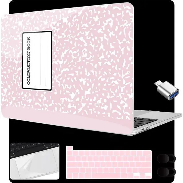 MEEgoodo for MacBook Pro 13 inch Case 2022 2021 2020 A2338 M2/M1 A2251 A2289 with Touch ID,Clear Laptop Hard Shell Cases with Keyboard Webcam Cover&Trackpad Film& Type C Adapter, Pink Composition Book