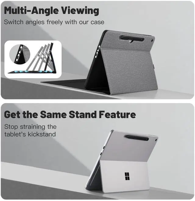 Any-Angle Freedom Stand: Effortlessly transition between laptop, studio, and tablet modes - more versatile than standard surface pro 12 case. Perfect for work presentations, creative sketching, or media viewing. Our reinforced stand mechanism securely holds your device in any position while protecting the tablet's built-in kickstand