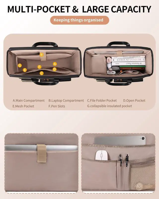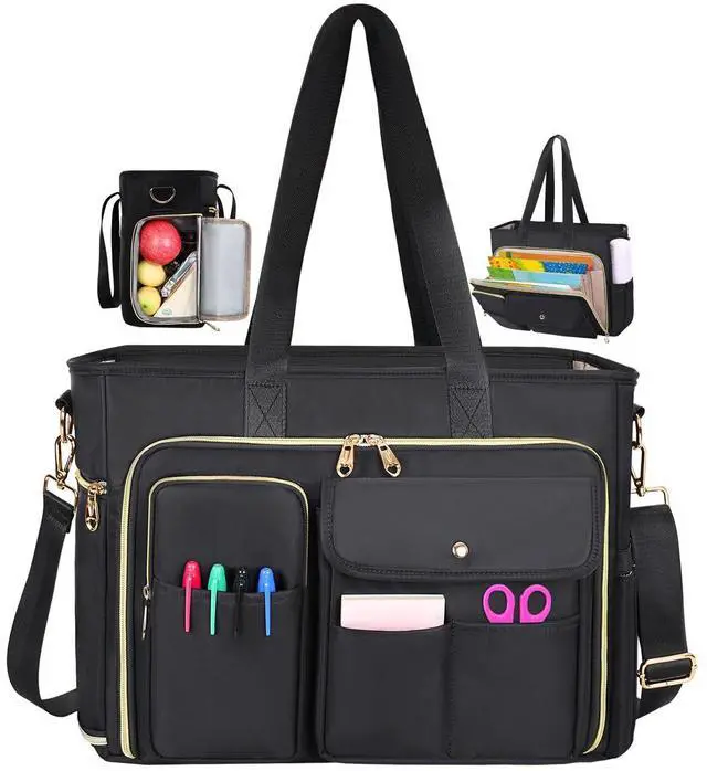 Large Capacity & Multi PocketsLaptop Tote Bag Size: 16.9 * 11.8 * 5.9in, Weight: 2.4lbs. Fits up to 15.6'' laptop. Comes with 12 multifunctional pockets to reasonably organize all your work essentials and personal belongings. 1 x main compartment; 1 x 15.6'' padded compartment; 1 x interior organizer for categorizing teacher accessories such as note pads, pens, and eyeglasses; Multifunctional front and back quick access pockets; 1 x Side pocket for water bottle; 1 x Insulated pocket.