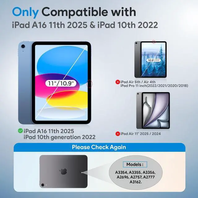 Compatibility: This Tempered Glass screen protector is only compatible with iPad A16 11th Generation 2025 and iPad 10th generation 2022. Compatible Models: A3354, A3355, A3356, A2696, A2757, A2777, A3162. Please check the size of your iPad before purchasing to ensure that when you receive this product, it will fit your iPad