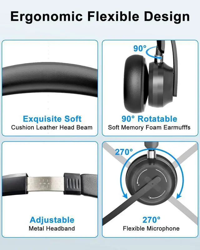 Adjustable Headset with Mic & All-Day Comfort: Featuring soft, breathable protein memory foam cushions and adjustable headband to prevent heat and sweat during long use. The 270° rotatable mic and 180° swivel cups fit either ear. All-day wear without pressure or discomfort. (Weighs just 0.3lb/5.09 oz)