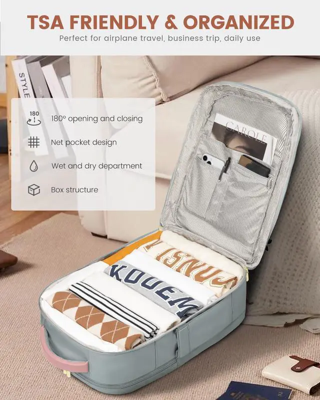 Airline Approved & TSA Friendly : Experience stress-free air travel with our carry on backpack. Measuring 14.2" x 9" x 19.7", it fits comfortably in overhead bins and under the seat. Designed for quick security checks, it opens 180 degrees, making it the perfect travel companion for your journeys.