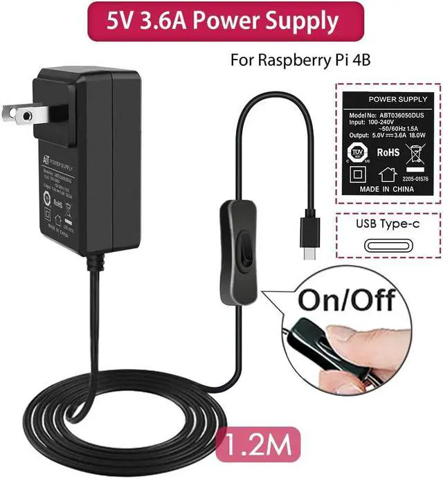 • 5V 3.6A Type C Power Supply will make your Pi work more stable. With ON/OFF switch, it's convenient for you to power on and power off.