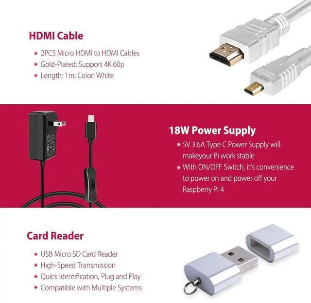 • Package Includes:1x Pi 4B (4GB RAM); 1x Case; 1x Cooling Fan; 4pcs*Aluminum Heatsinks; 1x 5V 3.6A Power Supply; 1x 64GB SD Card (with Card Reader) ; 2x 4K Cables