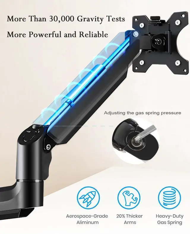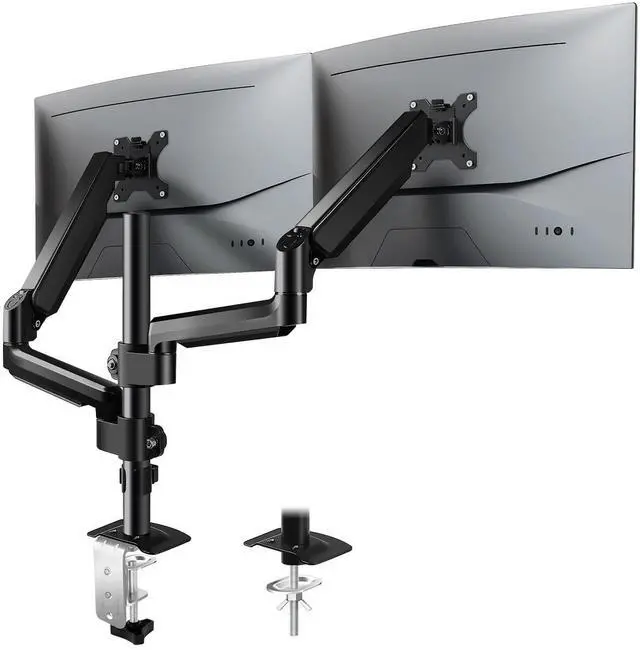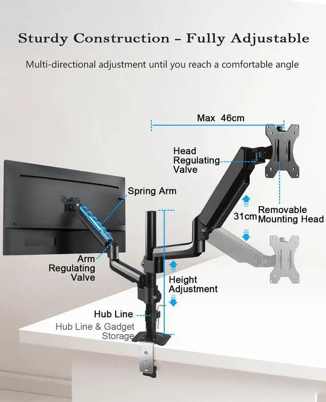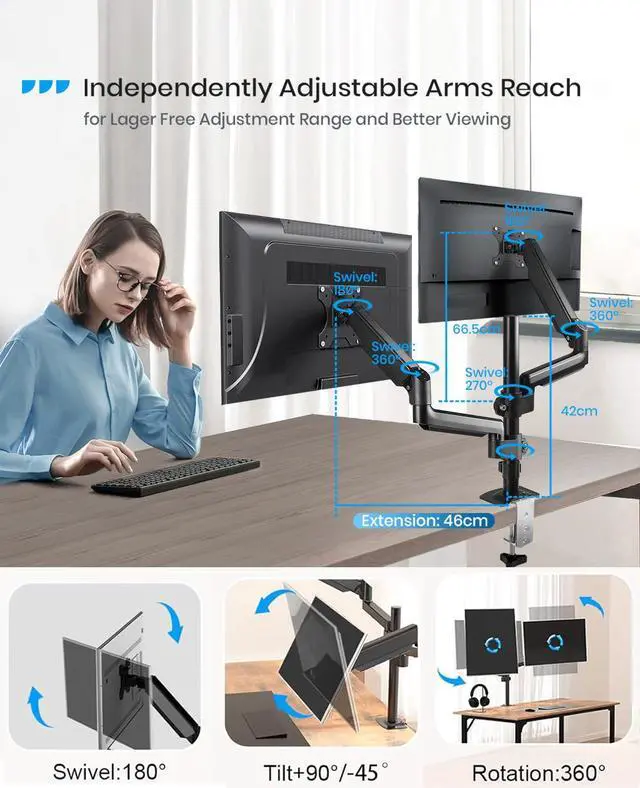 Full Adjustability This fully movable dual monitor arm uses a premium gas spring monitor arm (-45° to +90° tilt, 180° translation, 360° rotation). You can easily lift up the dual monitor screen stand and easily extend the monitors 49 inches with one hand to find the best viewing angle and the most comfortable er
