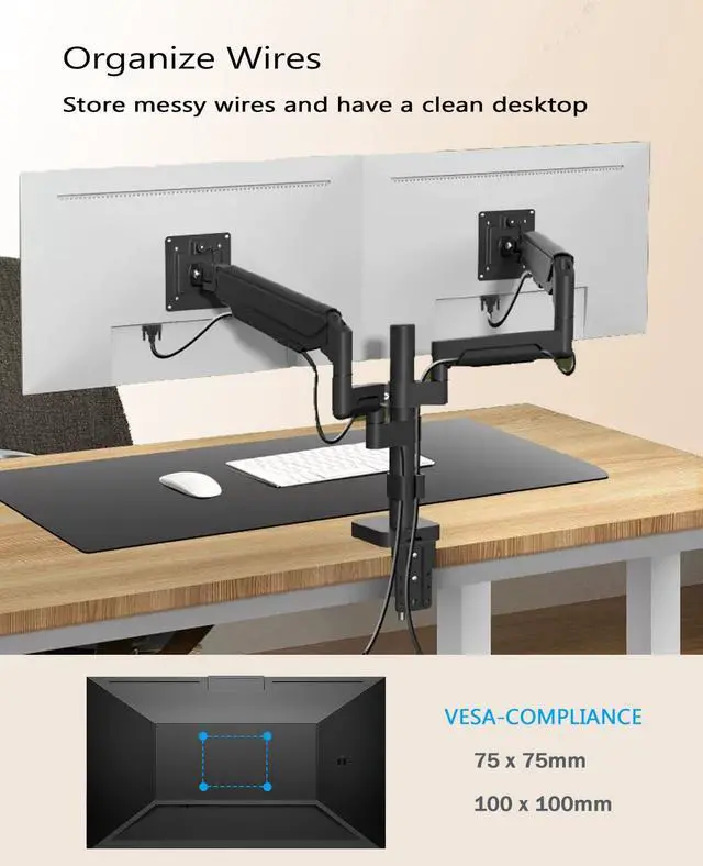 Compatibility and High Load Capacity The gas spring dual monitor arm with a load capacity of 2-9KG per arm is suitable for 13 to 32 inch monitors. The two arms can be completely independent. Its VESA monitor arm is compatible with both 75x75 and 100x100 mm. We recommend that you check this information carefully before purchasing.
