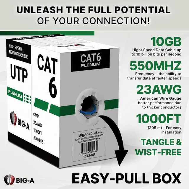 Power up your network with the Big-A Plenum Cat 6 Ethernet Cable, a professional-grade solution for high-speed data transmission in commercial and residential setups. With a CMP plenum rating, this 1000ft bulk cable is specifically designed for safe installation in air-handling spaces, such as ceilings and walls, ensuring compliance with industry safety standards. Built for versatile networking needs, this Cat6 cable is compatible with PoE devices, routers, switches, IP cameras, VoIP systems, and more. Whether you're setting up a home network, office, or large-scale commercial infrastructure, this cable provides the durability and flexibility needed for seamless connectivity.