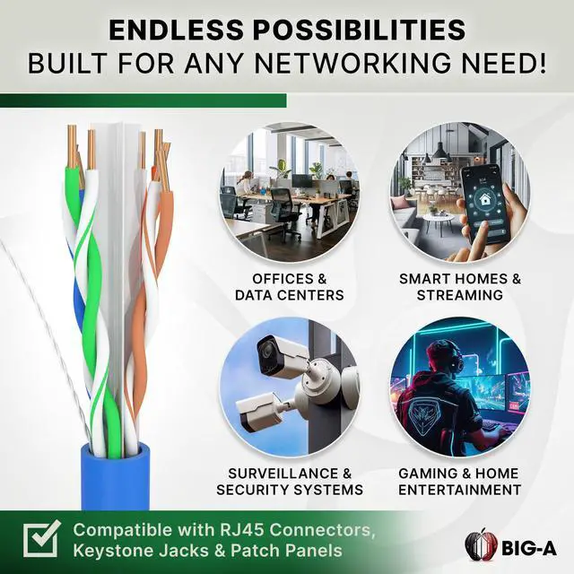 Easy Pull Box Design Comes in a 1000ft tangle-free spool, making installations faster and hassle-free. Versatile Networking Solution Works with Cat6, Cat5e, and Cat5 devices, supporting security systems, networking infrastructure, and enterprise applications.