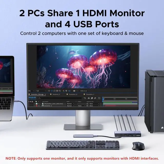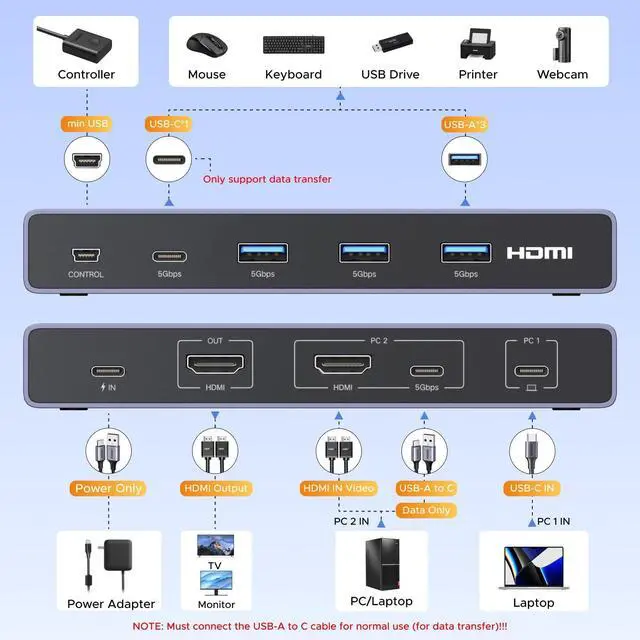 USB-C+HDMI KVM Switch 1 Monitor 2 Computers: This HDMI and USB C KVM switch allows a USB-C laptop and a computer to share one monitor and four USB devices such as a set of keyboard, mouse, hard drives, U disk, and printer. Centrally control your 2 computers on one monitor, which helps you switch effortlessly between work, gaming, or home setups with a single button. NOTE: The PC2 must connect an HDMI cable (for video transfer)+1 USB-A to C cable (for data transfer) for normal use