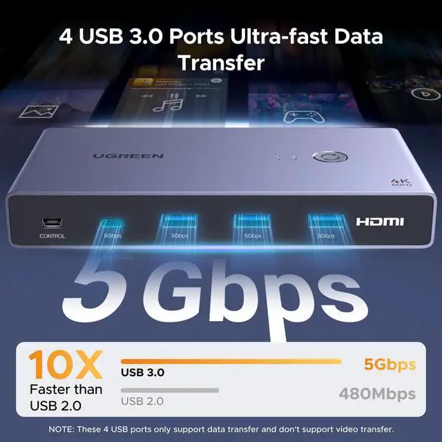Support Up to 4K@60Hz: UGREEN KVM switches support the resolution up to 4K@60Hz, also support 4K@30Hz, 2560*1440@120Hz and lower resolution. This KVM switch HDMI+USB-C also supports HDMI 2.0, HDCP2.2, 3D, and HDR 10+, which makes images display more exquisite and realistic, color is more bright and moving, really giving a feast for your eyes