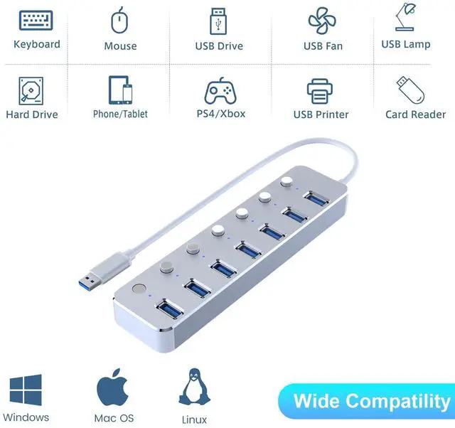 7 High-Speed USB 3.0 Ports Expand with ConfidenceExpand your devices connectivity with 7 high-speed USB 3.0 ports. This usb hub for pc can easily connect multiple devices like flash drives, keyboards, mice, and external hard drivesno more plugging and unplugging with limited ports.Solve the problem of limited USB ports on PCs and notebooks with ease.