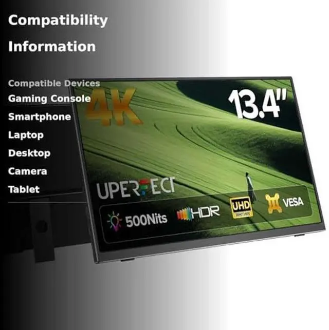 13.4" 4K UHD Portable MonitorCompact 13.4-inch portable monitor with 3840×2400 4K UHD resolution and 16:10 aspect ratio, offering sharper details and more vertical workspace. Perfect as a travel monitor, external display, or second screen for laptops, tablets, and gaming consoles.