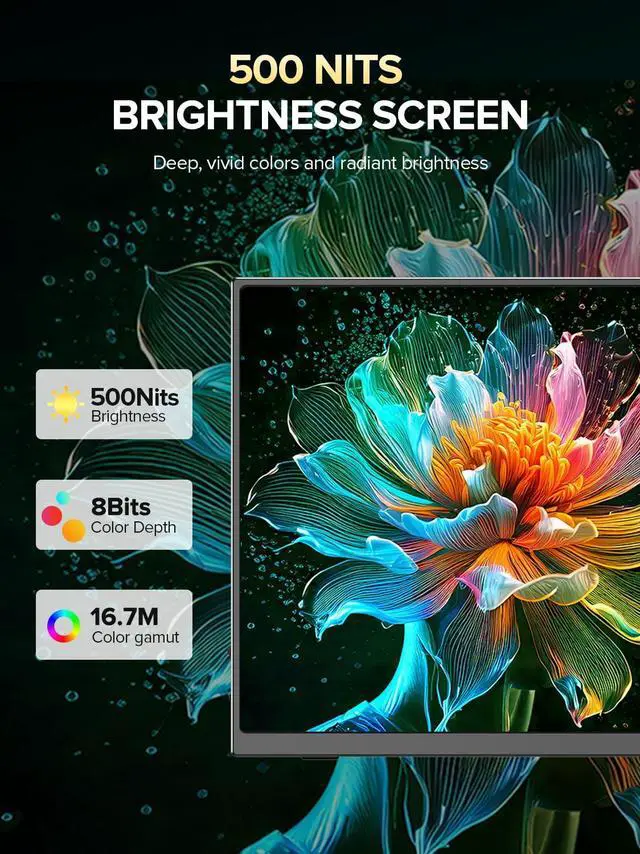 IPS Matte Display with 500 nits & 100% sRGBEnjoy vivid, accurate colors on a matte IPS screen with 500 nits brightness and 100% sRGB color gamut. This UPERFECT portable monitor delivers professional-level visuals, reduces glare, and provides smooth viewing for designers, content creators, office work, and entertainment.