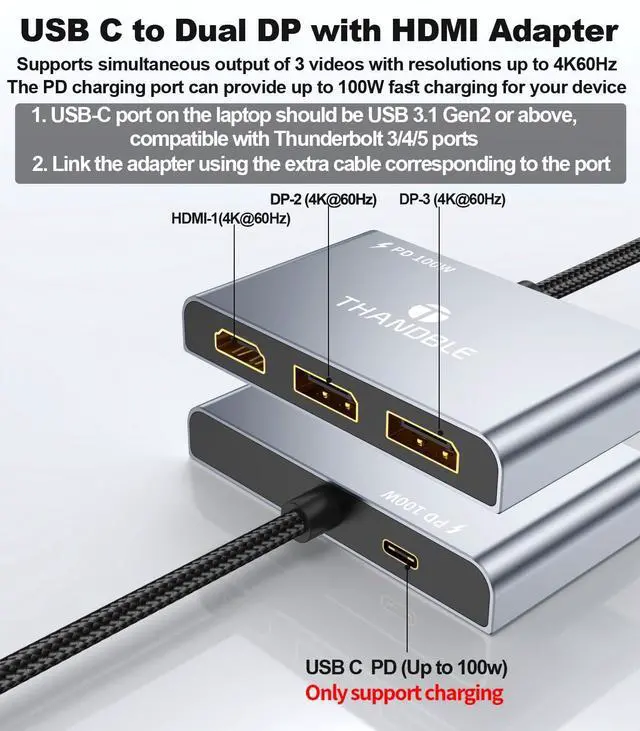 HDMI Port: 4K@60Hz Triple Display & 100W PD Charging Extend your workspace with 3 independent 4K@60Hz HDMI outputs (HDMI 2.0 /DP 1.2 ) via 18Gbps bandwidth. Features 100W PD 3.0 fast charging to power laptops while driving triple screens. Nickel-plated anti-interference ports ensure stable 4K streaming. Compatible with Thunderbolt 3/4/5 and USB4 Windows devices (MacOS mirrors only). Plug & playno drivers or external power required