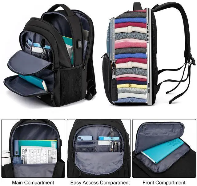 Large Capacity & Organized -One separate laptop compartment hold 17.3 Inch Laptop as well as 16 Inch,15 Inch and 14 Inch Laptop. One spacious packing compartment roomy for daily necessities,tech electronics accessories. Front compartment with many pockets, pen pockets and key fob hook, makes your items organized and easier to find