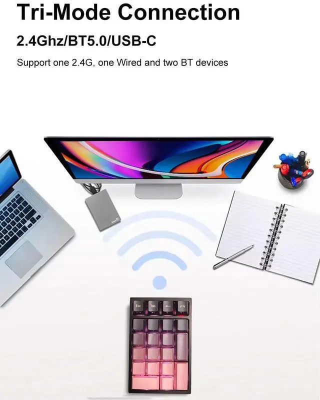 2.4G /BT 5.0 /USB-C: The laptop numpad supports three connection modes including Wireless 2.4G hz, Bluetooth 5.0 and Wired USB C. Easy to connect and switch devices. No delays and dropouts. Fast data transmission. 2.4G range up to 26ft/8m, bluetooth range up to 16ft/5m.